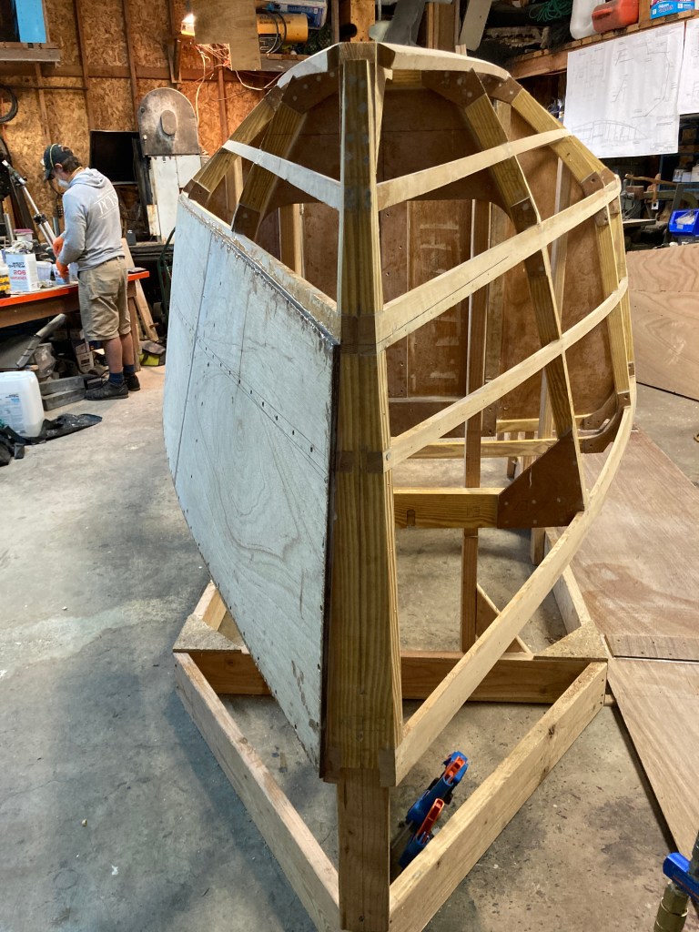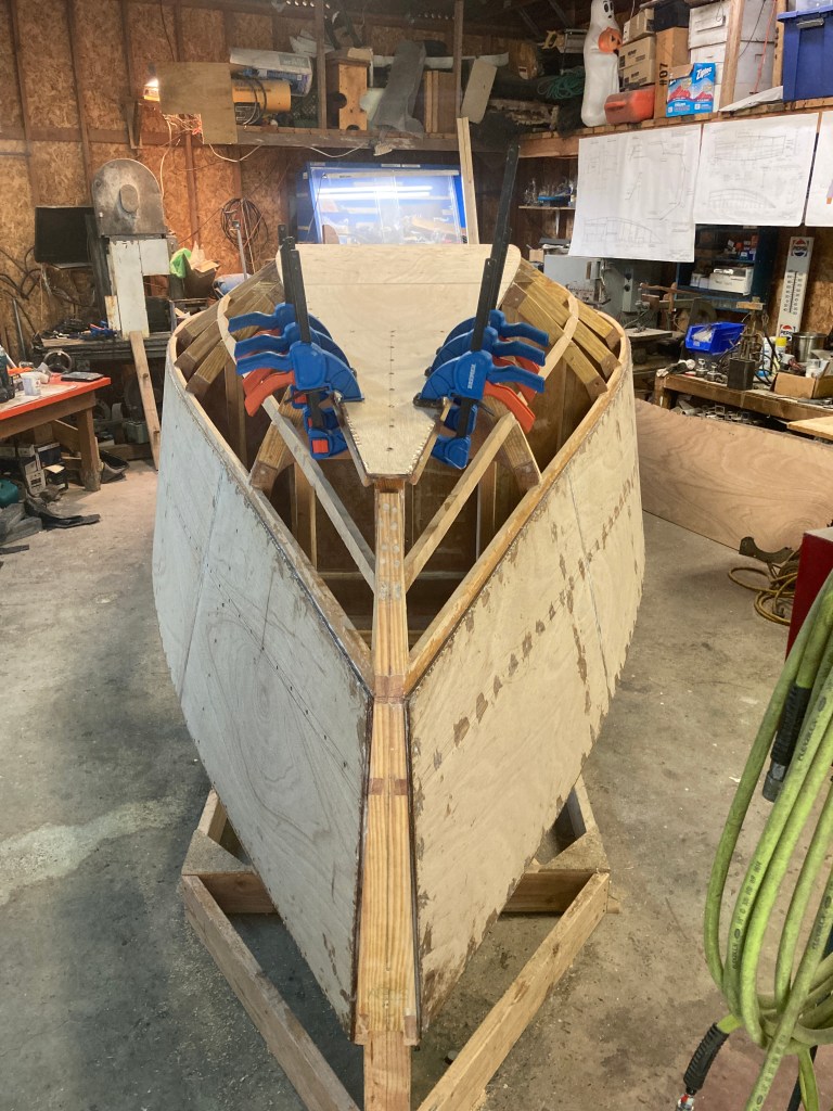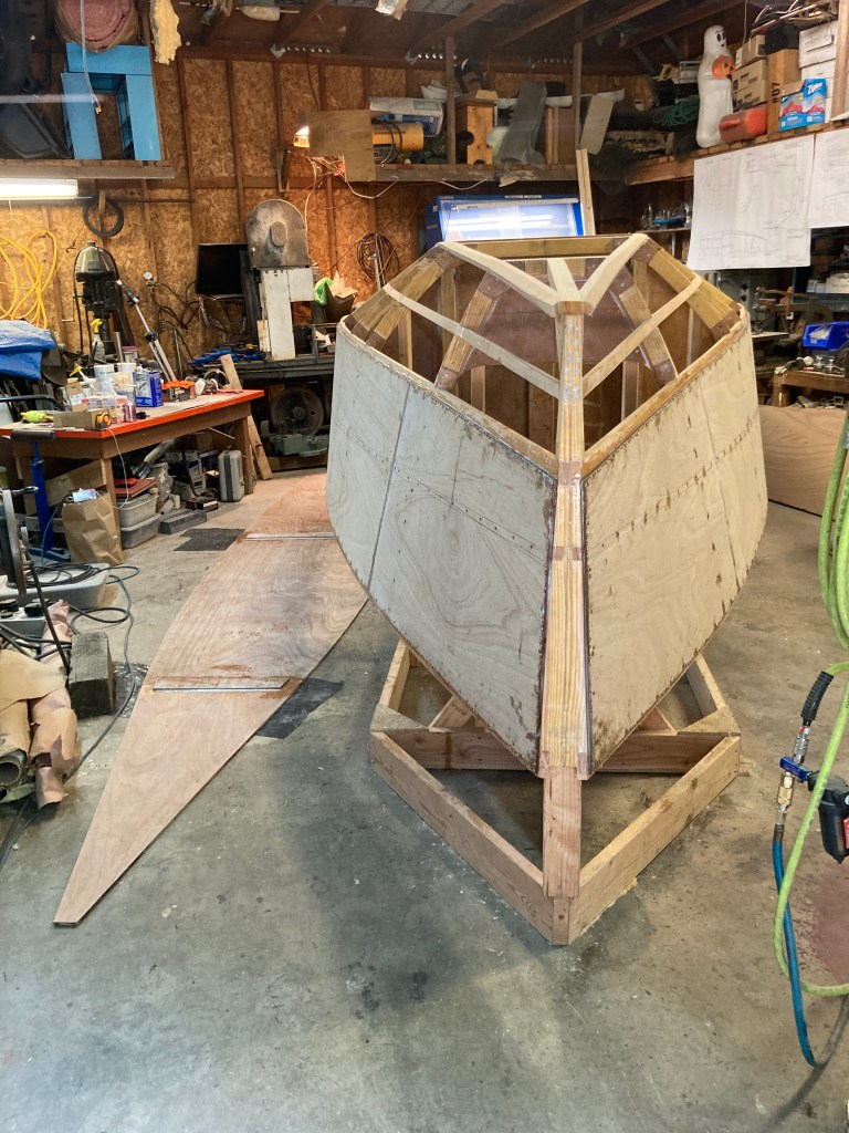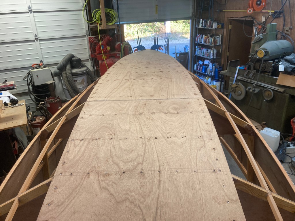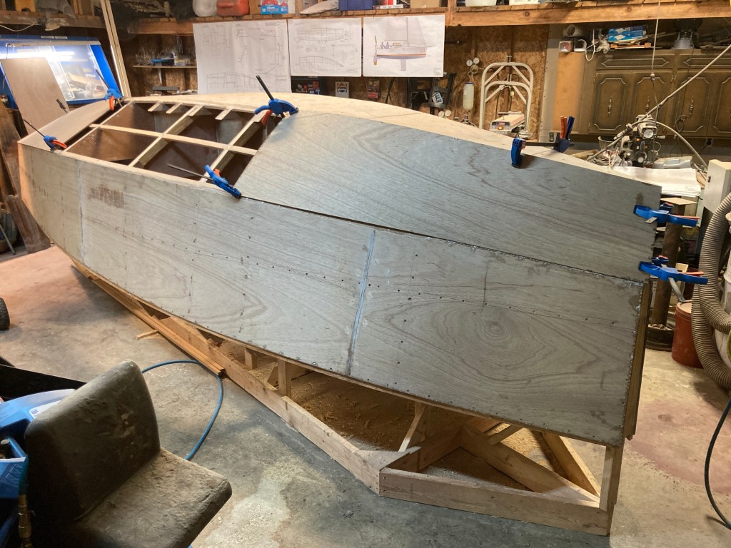 Finally it’s starting to look like a boat! Getting the hull planked was a big step and now it is on to shaping it up a bit, taping the seams with fiberglass and then covering the hull with 600g/m2 of 1708 fiberglass cloth. Then it’s time to fair the hull to shape! Thanks for reading!