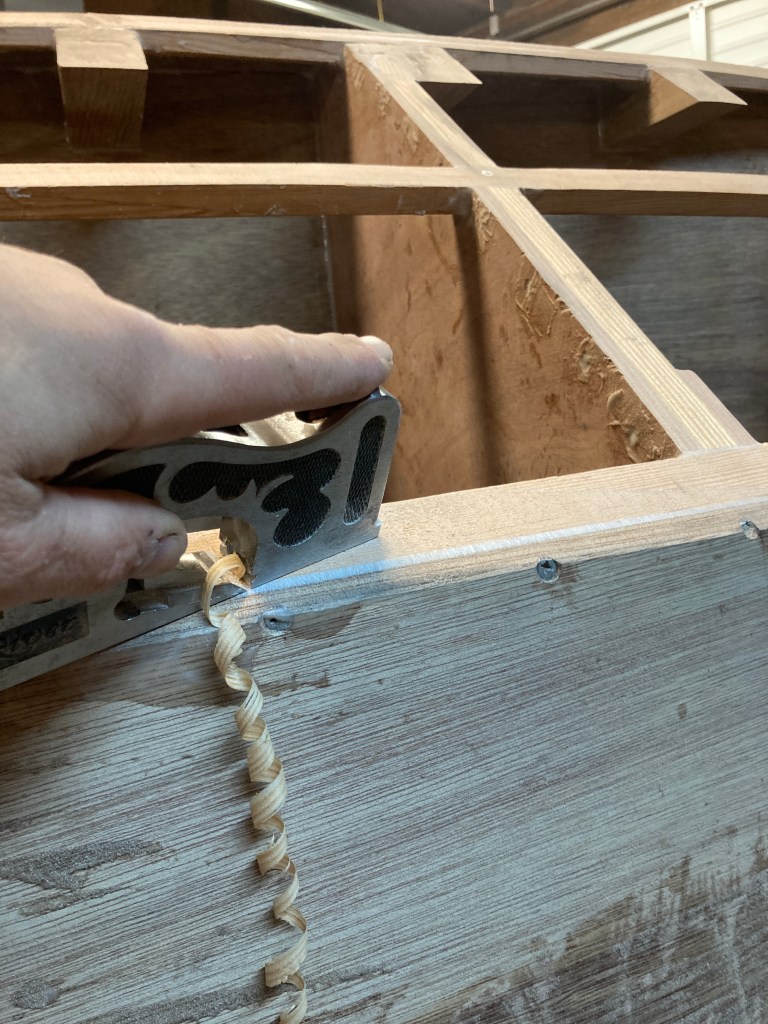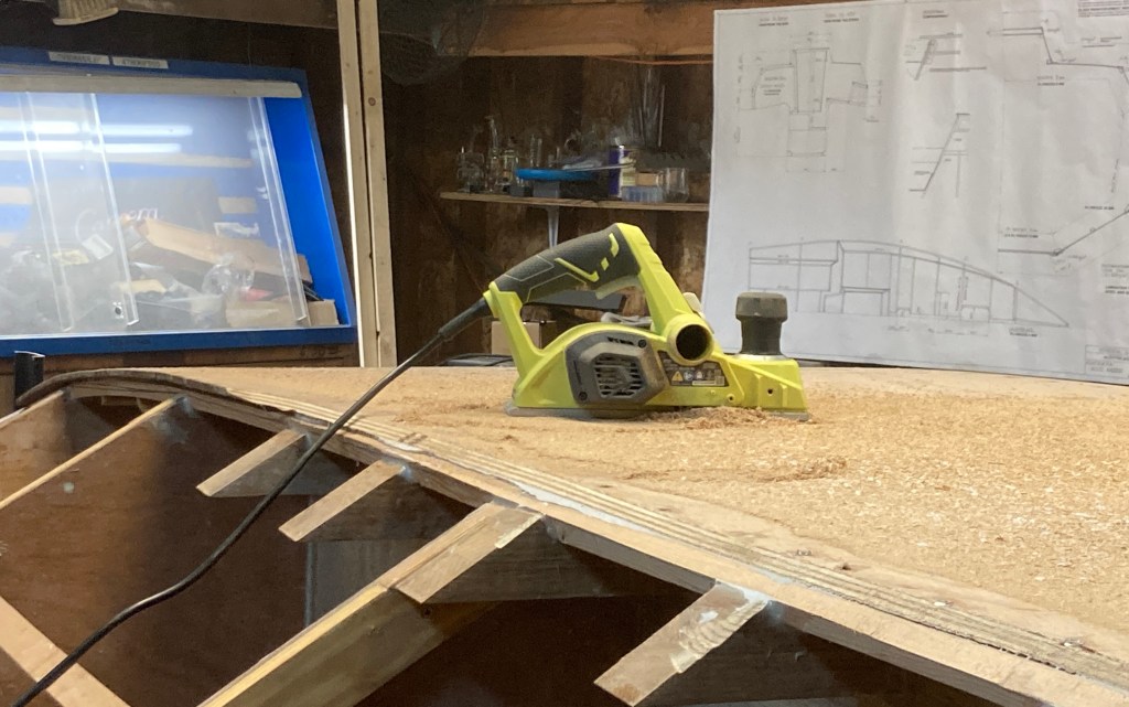 Next I began preparing the surfaces of the frames by beveling off the excess material left outside of the line of planking when I let the stringers into the frames. I did this using a combination of the Ryobi electric plane and a hand plane.