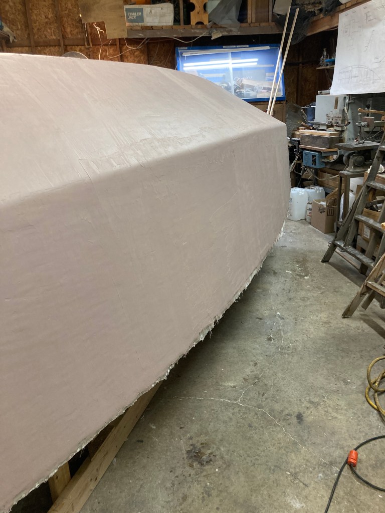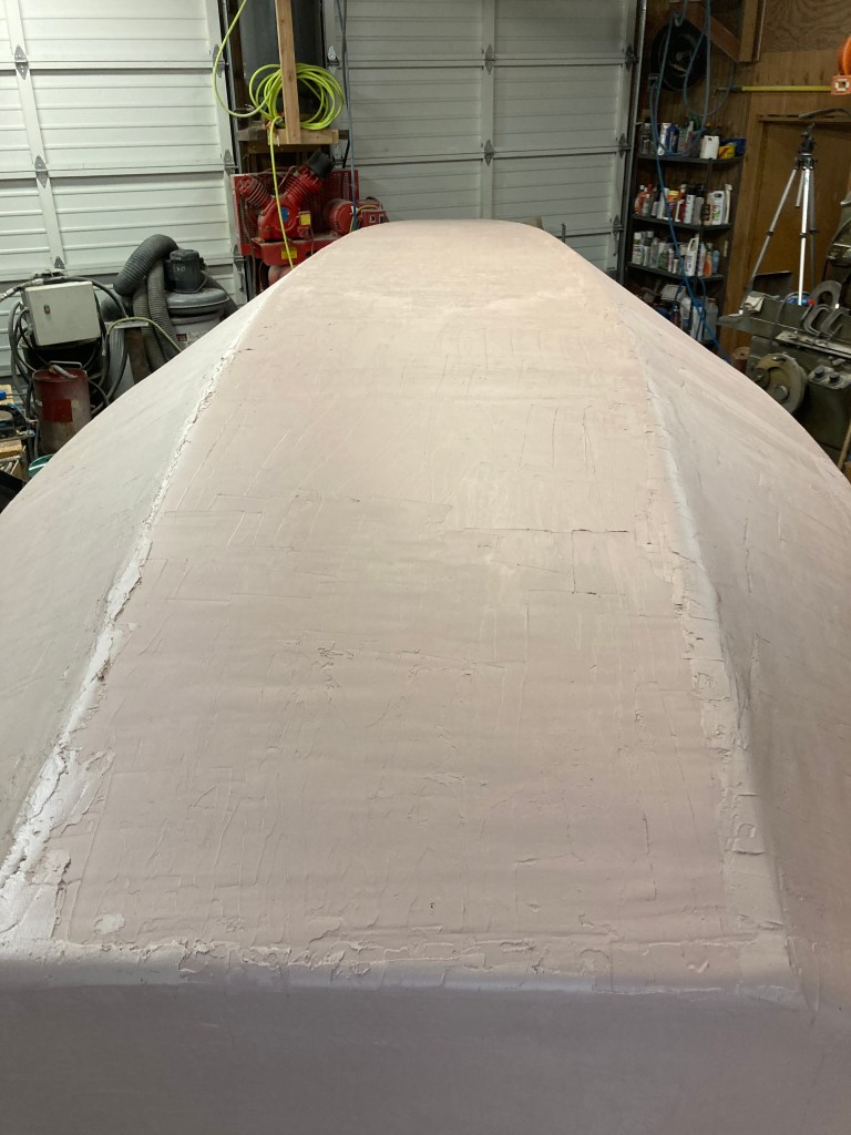 For the second round of filler I went over the hull with my hand and marked the noticeably low spots with a pencil. Then I filled in the marked areas with filler and also pulled down a thin layer wherever it was still a little rough. I found that having the right tools made a big difference. On the first coat I just used a yellow epoxy spreader which left marks in the surface wherever I touched it down when pulling it out. For the rest of the coats I acquired a drywall ‘flexible hammer-end joint knife’ as well as a ‘12” taping knife’. These allowed me to pull the compound down much thinner and more evenly with less deep marks left from the trowel.