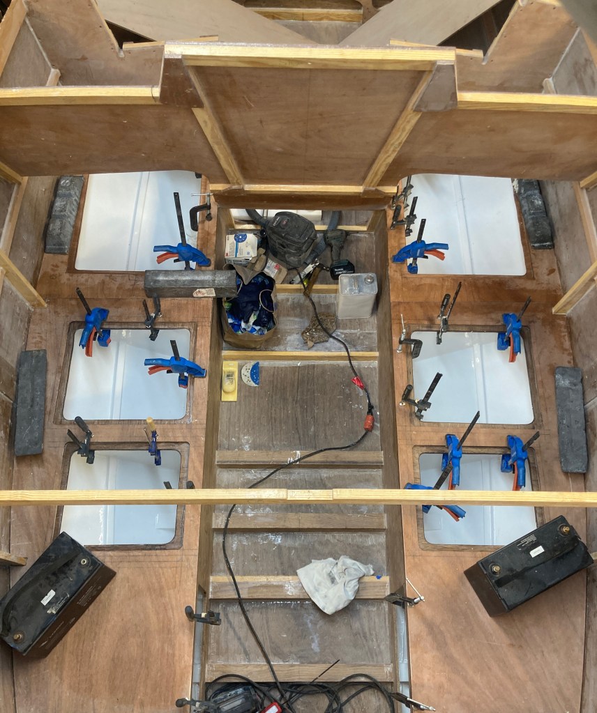 Once the paint had cured I glued the bunk tops down using thickened epoxy, many clamps and several heavy objects. They significantly increased the stiffness of the hull and feel very solid.