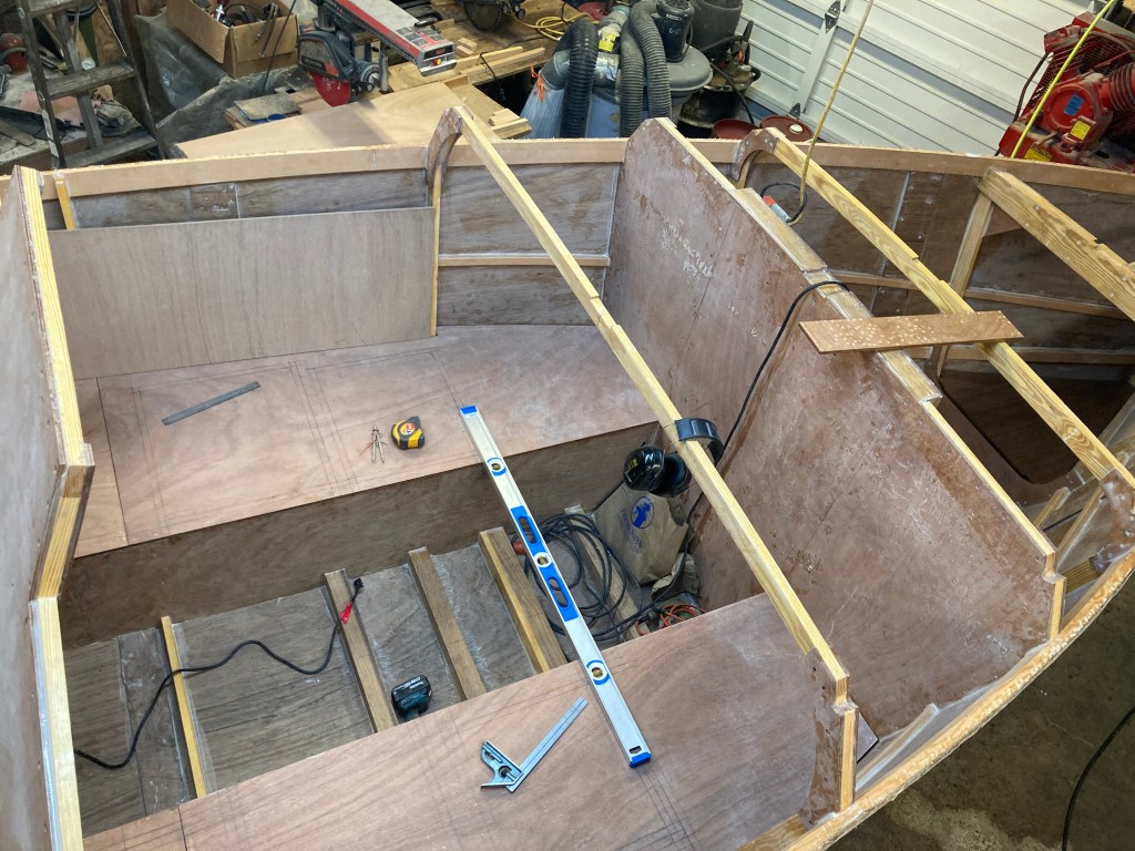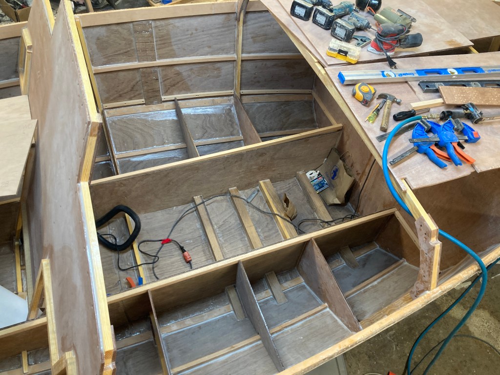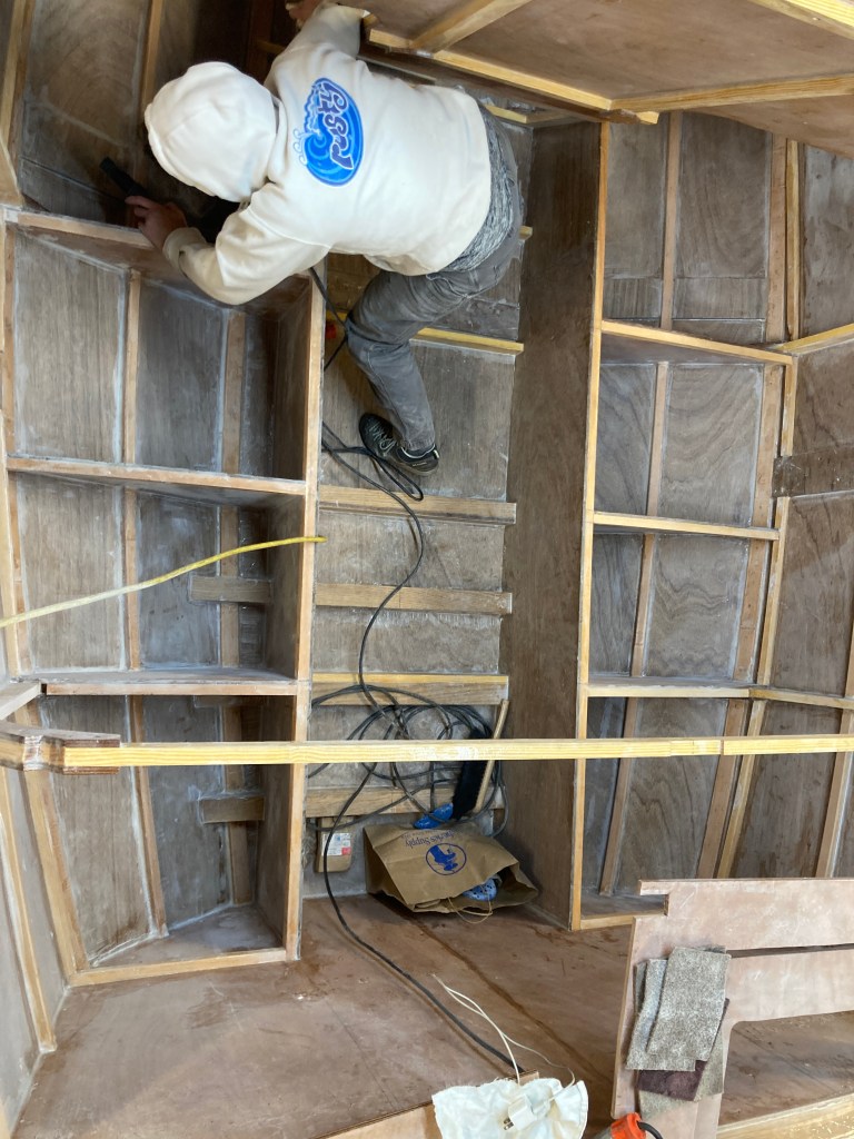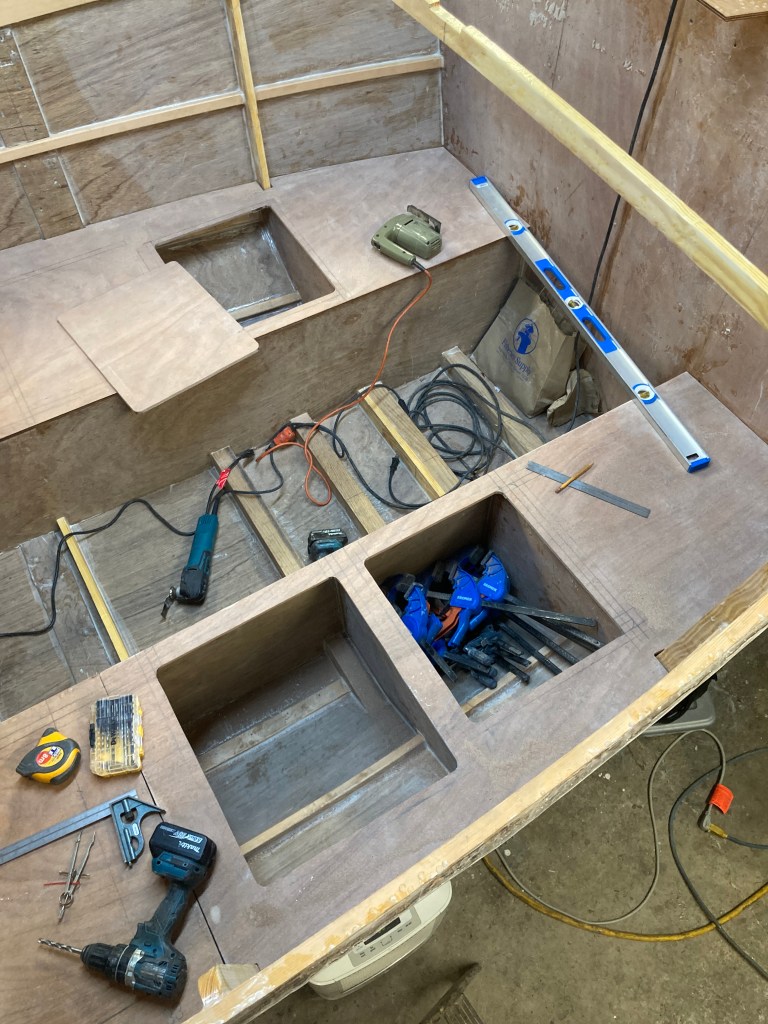 With the boat finally flipped upright it was time to get started on the major interior pieces; bunk tops with storage underneath as well as the floor in the vee birth and it’s complimentary storage. I wanted to get the larger components installed that would otherwise be too big to fit in once the deck panels were put on. In the essence of time my plan was to complete this phase and then close up the deck and cockpit before finishing the interior. The idea being that I can sail with a less than perfect interior but not without a deck.