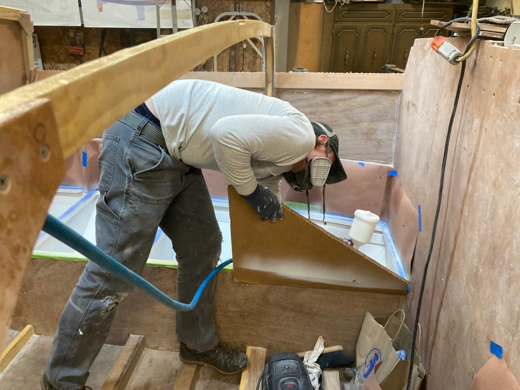 Now it was time to paint the compartments before gluing the floor down. For the coating I applied the same process that I used under the berths in the cabin and everything came out great. I didn’t paint the crash box area as once it is filled with foam it will not likely be seen again.