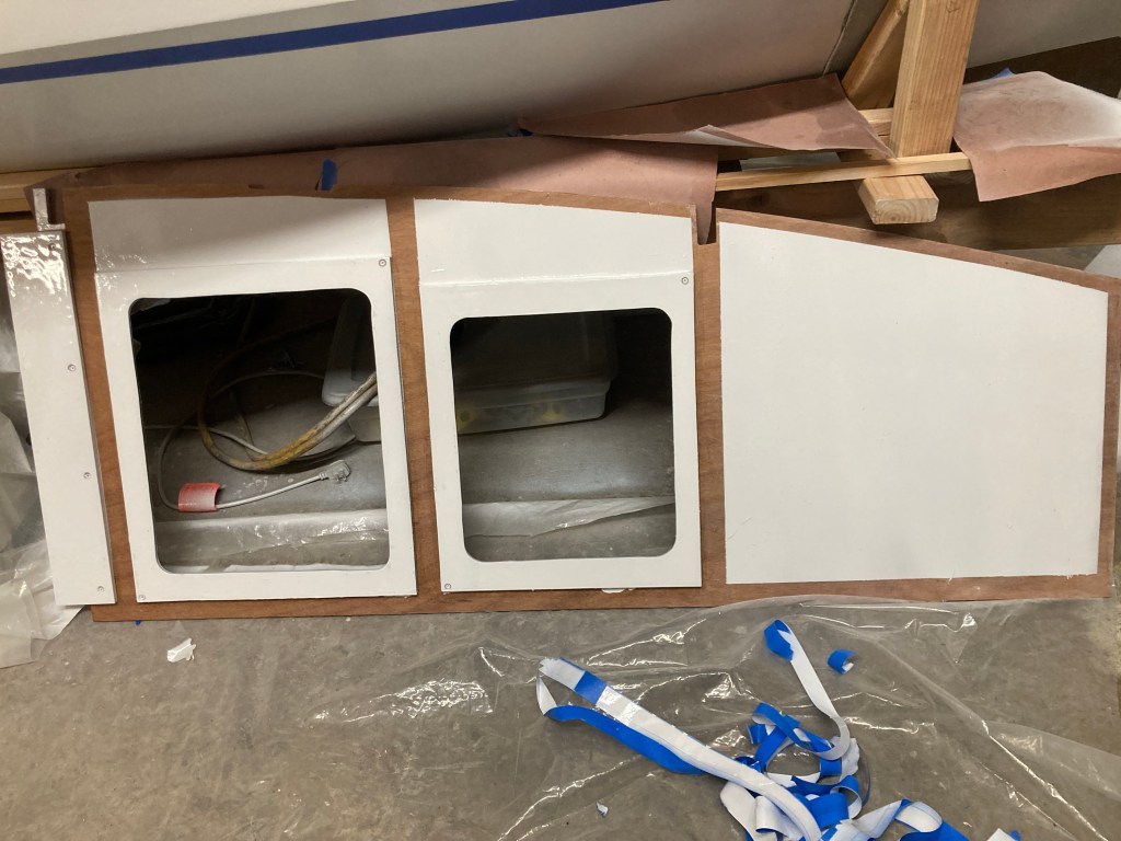 I started in the main cabin by dividing the four spaces under the bunks into six, three being on each side. I patterned and fabricated two additional bulkheads and got them epoxy coated before installing them into the hull with thickened epoxy. They effectively split the forward spaces under each berth into two, turning the spaces into three total compartments each side. One small, one medium, and one large.
