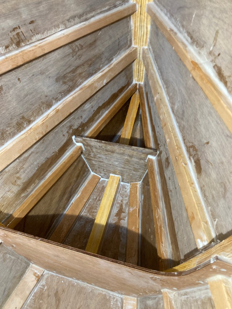 The next step was to make and glue in all of the cleating that would give support to the bunk tops. I used Douglas Fir and cut them to 7/8in square pieces. Likely one of the only imperial measurements used in the entire construction. I installed them around the perimeter on the inside of the hull and along each of the bulkheads. This made for a strong and stiff platform to finish the bunks.