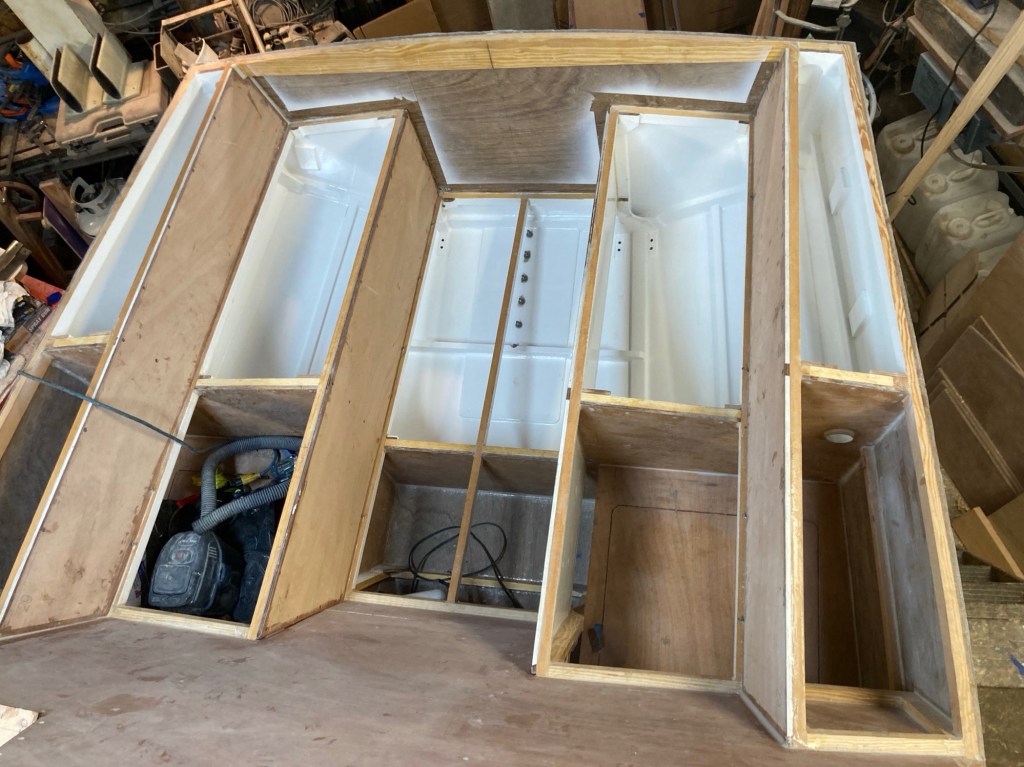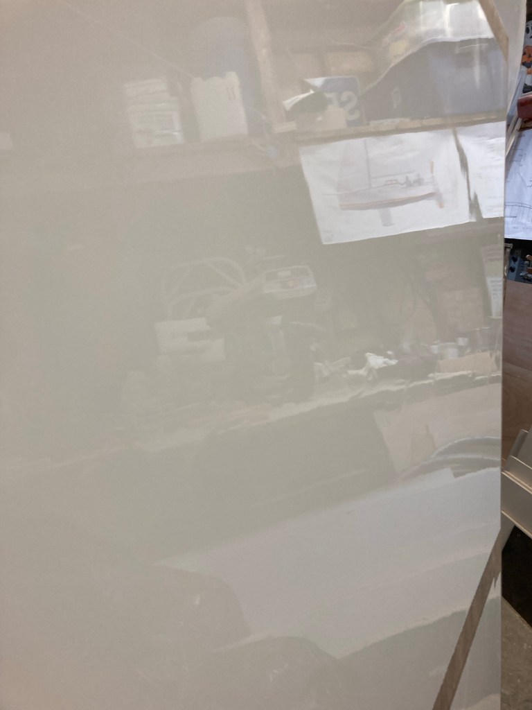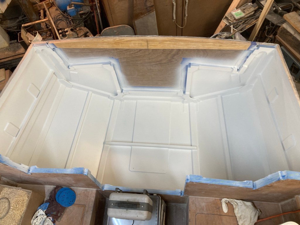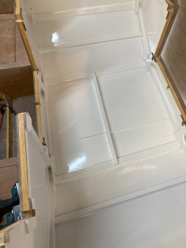 To make it easier on myself I wanted to paint the cockpit space before adding the framing for the panels and with all of the little bits finished up I began prepping the surface. I also painted the underside and insides of the paneling simultaneously alongside the hull. I used the same process as all of the other interior spaces so far. First I sanded the fillets and panels with 150 grit paper before spraying in two coats of Alexseal 442 finish primer. I sanded that with 320 grit and then sprayed on a third coat of primer. Once that cured, I sanded it smooth once more with 320, cleaned everything up the best that I could, and sprayed in two coats of Alexseal 501 Snow White topcoat. I let that dry, sanded it with 320 grit and then sprayed in the final topcoat. It looked pretty good for cockpit locker storage but I was really just practicing for the interior later. To that end I went ahead and wet sanded it 1000 grit, 2000 grit and then buffed with light and then superfine compound. I am a bit of a nerd when it comes to finishes.