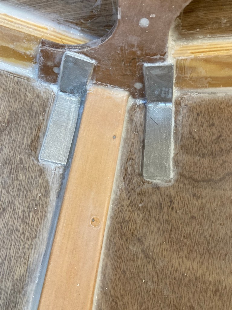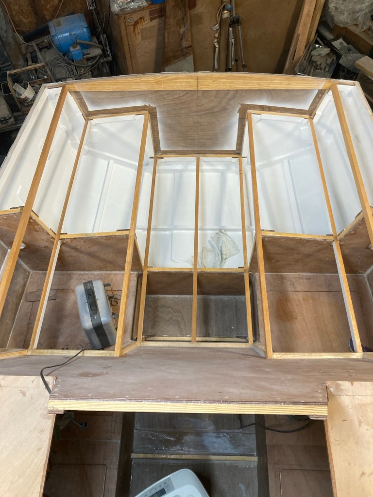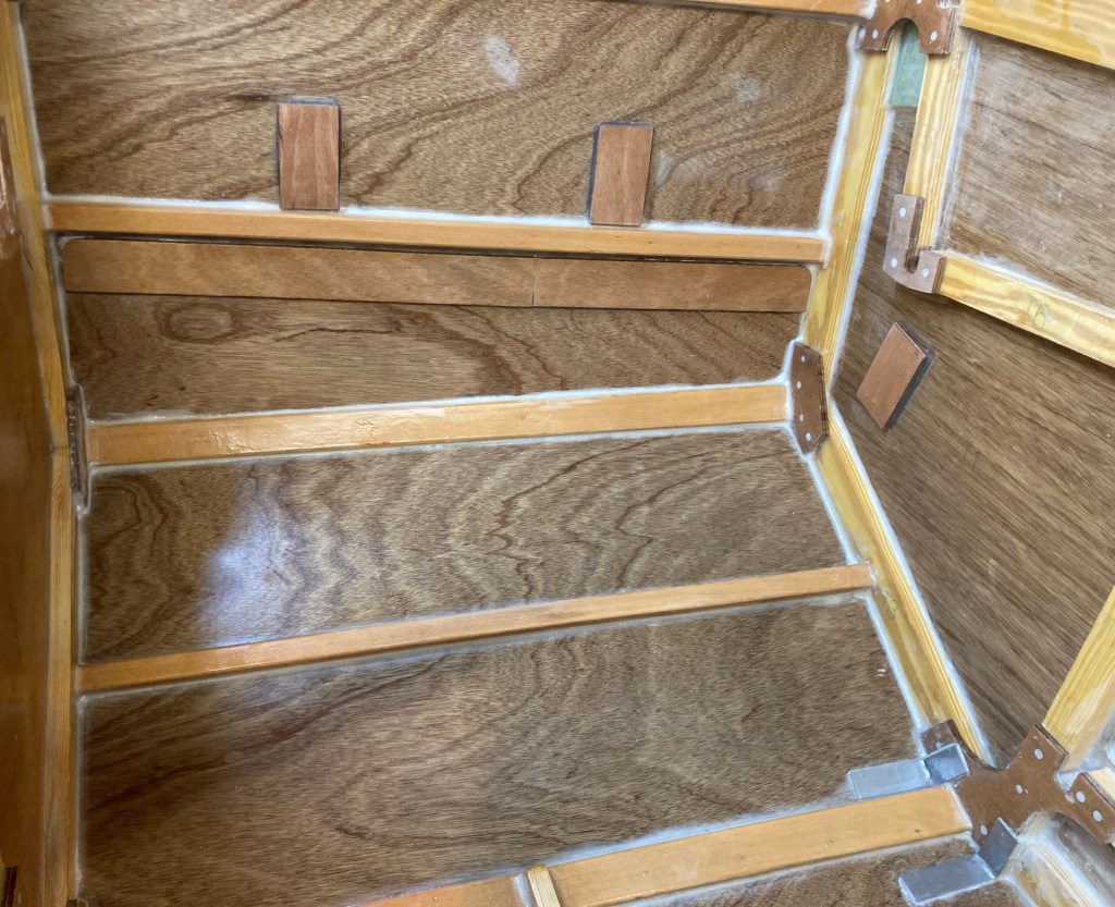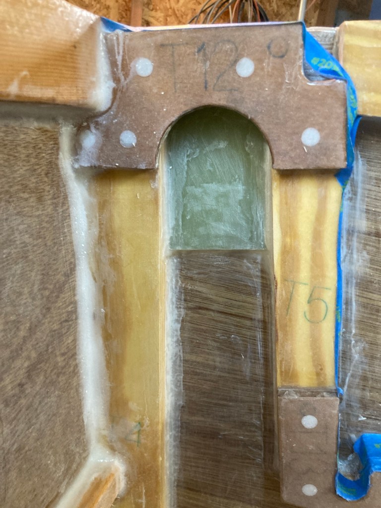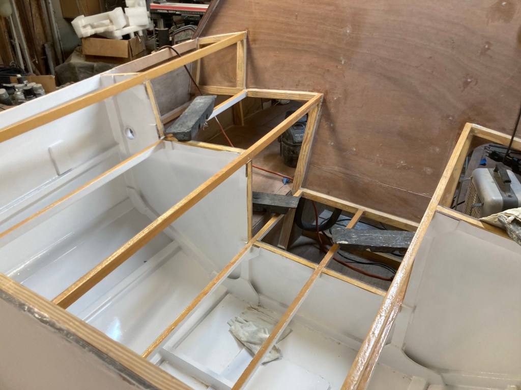 I also added some pieces of 1/4in (6mm) G-10 plate to the transom inside the coaming to act as backing plates for the running backstay chain plates. At this point I glued in the floor beam that goes across the floor of the cockpit. This was a cool moment for me because it was the last of the pine beams that came in the kit to be installed. It’s the little milestones like that that keep the project moving!