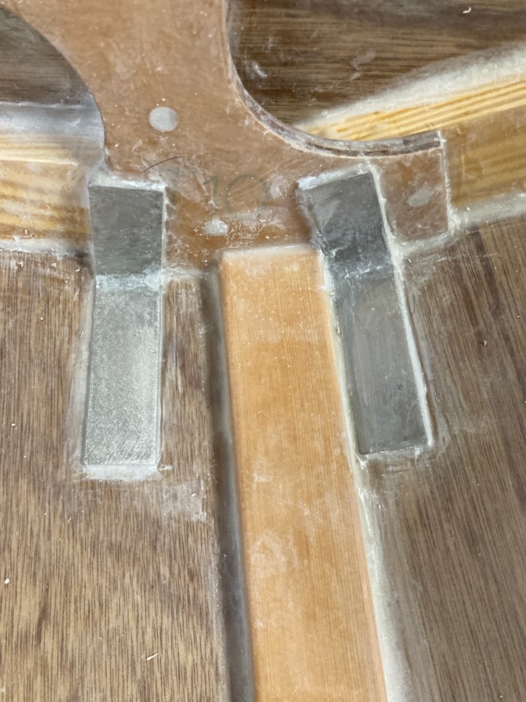 I bent the pieces of flat bar in the vise and fitted them to the inside of the hull in the location of my pre drilled holes for the daggerboards supports. I then bonded them in place with more of the West 105 / 404 filler mixture. I did not bother to drill the holes in the floor until after I had painted the space, no real reason, it just worked out that way. The inboard ones overhung the plywood slightly but a thick fillet of epoxy made quick work of that.
