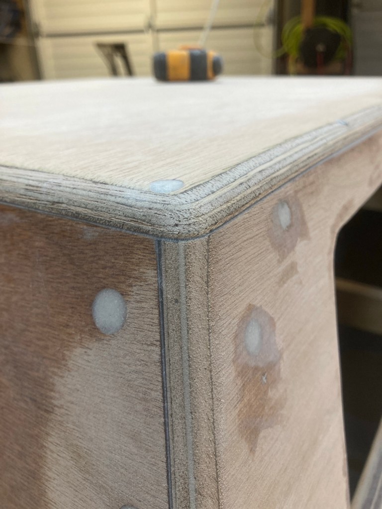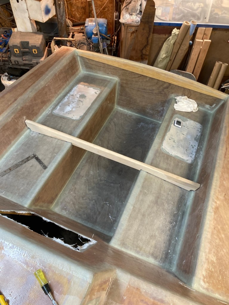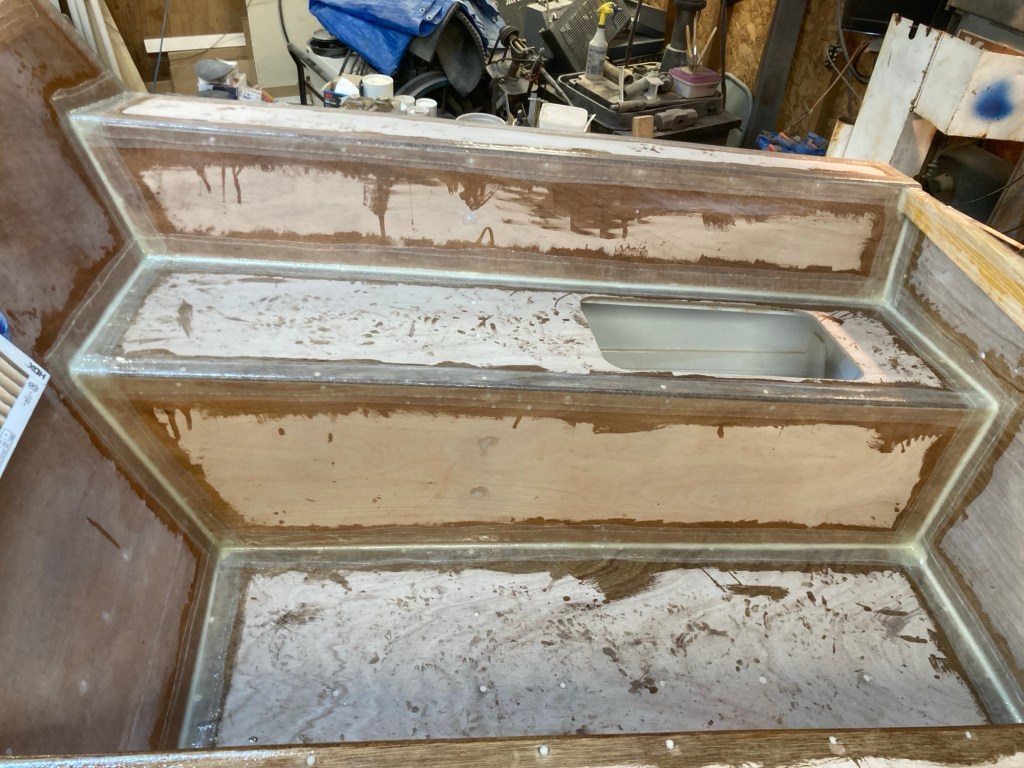 I made some additional reinforcements to the floor and seats of the cockpit. Instead of the two layers of 10oz (339g/m2) cloth that I used for the rest of the schedule, I used one layer of the 1708 biaxial cloth that I had left over from the hull followed by a layer of the 10oz. cloth for a total weight in these areas of 35oz or 1186g/m2. Super burly! This should add a considerable amount of strength to these high traffic, high wear areas. I could drop my anchor on the cockpit floor now with absolutely no worries.