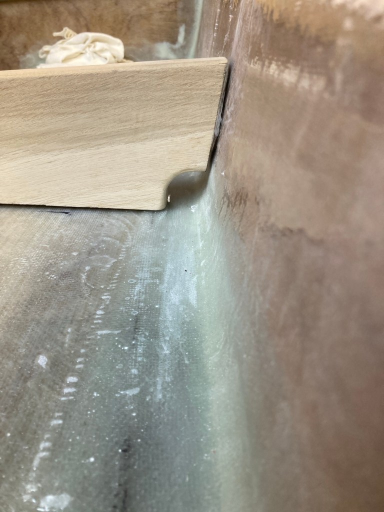 Fast forward to April and I finally scored a dry weekend with decent temps. I began taping all of the seams by doubling the requirement of the plans with 600g/m2 (20oz/yd.) all over the hull and 900g/m2 (60oz/yd.) securing the roof of the observation pod. I helped the cloth sit into the inside corners in the cockpit by applying a fillet of epoxy thickened with colloidal silica into each corner before I laid down the glass. This ensured that no bubbles could form in the corners as the mixture filled in any gaps where the cloth was reluctant to conform.