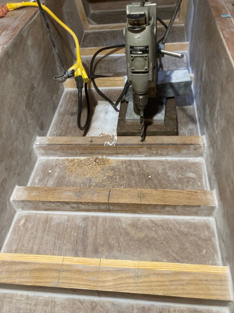 Using an old mag drill just set and balanced on the beams I was able to drill the holes nice and straight. Afterwards I taped the outside of the hull and inserted the tubes. Measured the length, cut, and glued them in place.